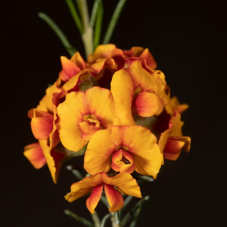 Most members of the pea family have approximately round flowers. Members of the Dillwynia group look like their flowers have been stretched to twice their proper width. This species has grey-green leaves and yellow flowers with red highlights. Grows in partial sun in well-drained (but not bone-dry) soil.